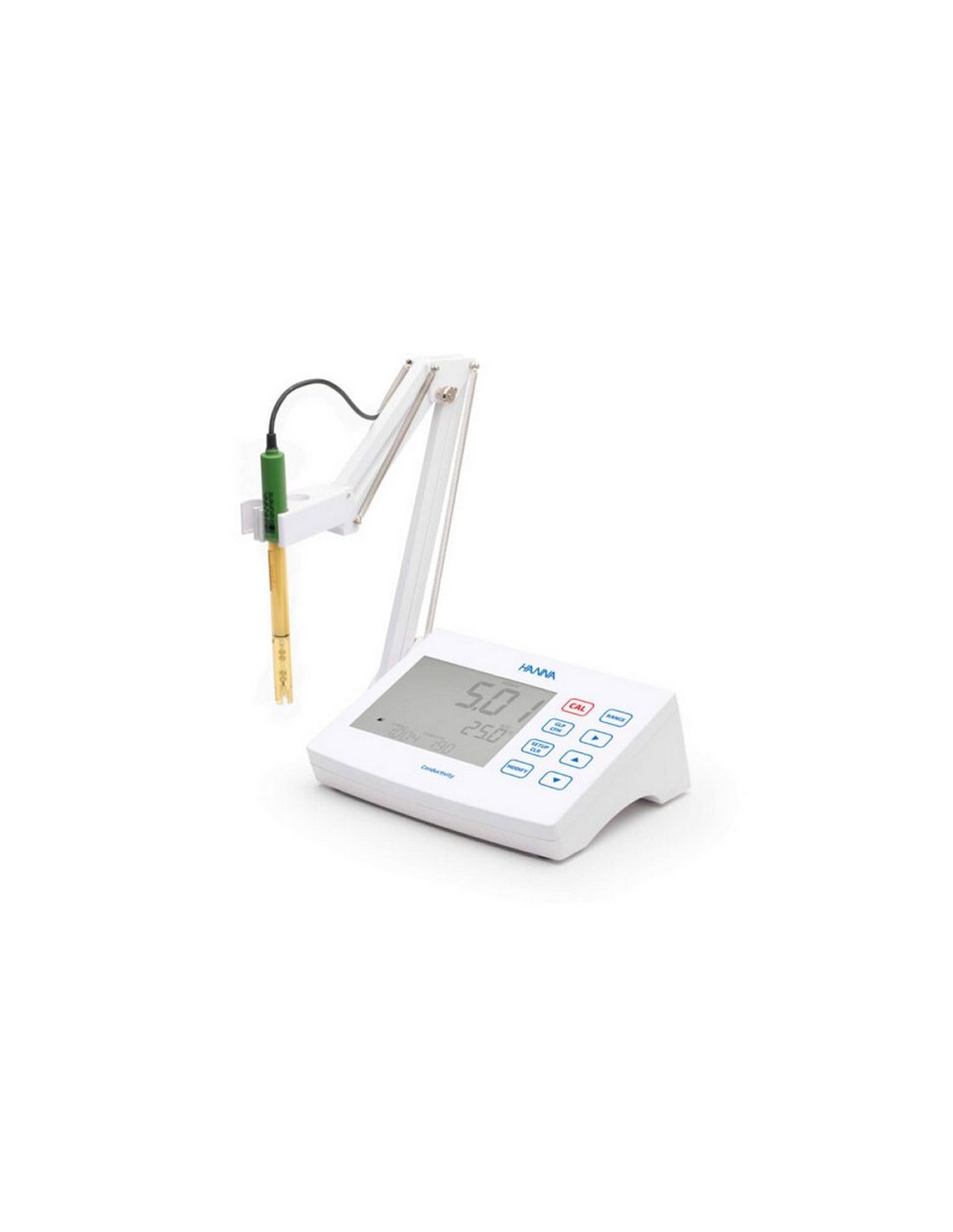 Laboratoryjny miernik z sondą przewodności, z wbudowanym czujnikiem temperatury do szybkich pomiarów. Sonda jest automatycznie identyfikowana przez miernik. Intuicyjna obsługa, duży wyświetlacz LCD, przyciski pojemnościowe, cyfrowe wejście sondy, wybór jednostek pomiaru, regulowana rozdzielczość, GLP, wewnętrzny zegar i data.