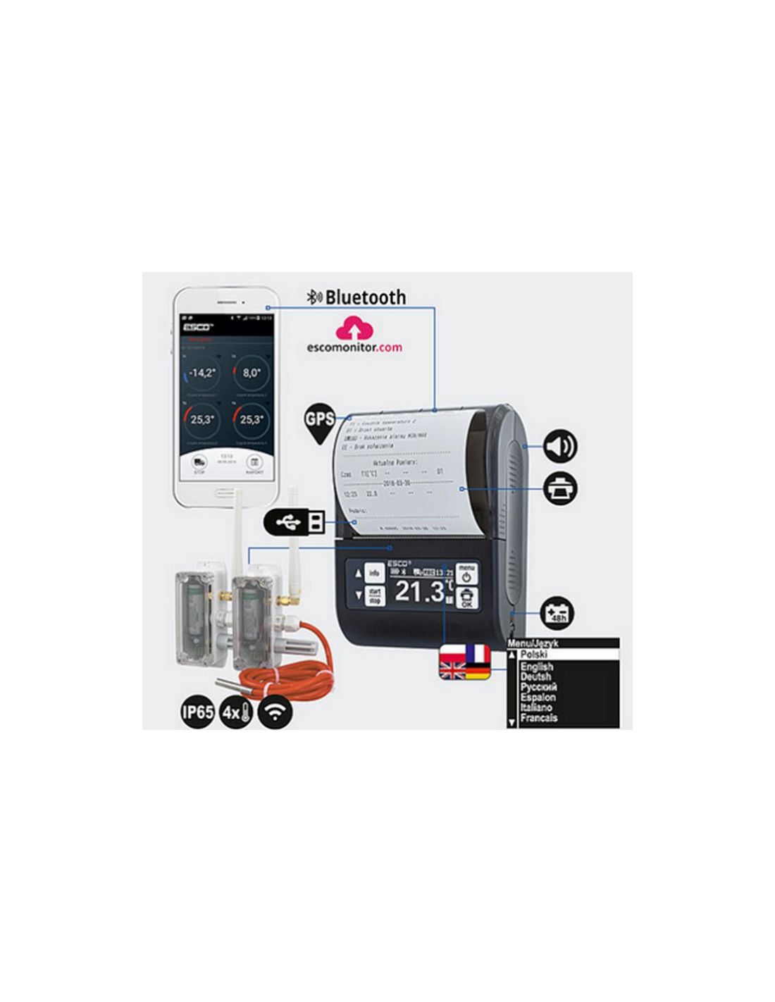 Rejestrator temperatury do kontroli parametrów w transporcie towarów, podczas magazynowania w kontenerach i chłodniach samochodowych oraz przechowalniach. Współpraca z 4 czujnikami bezprzewodowymi. Wbudowana drukarka termiczna i port USB. Wyposażony w uchwyt do montażu w kabinie kierowcy i ładowarkę samochodową.