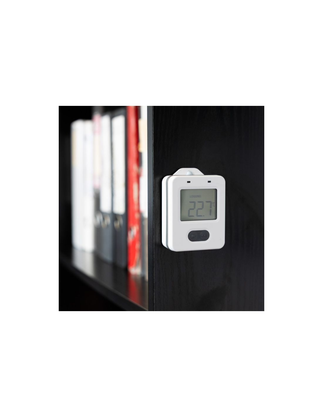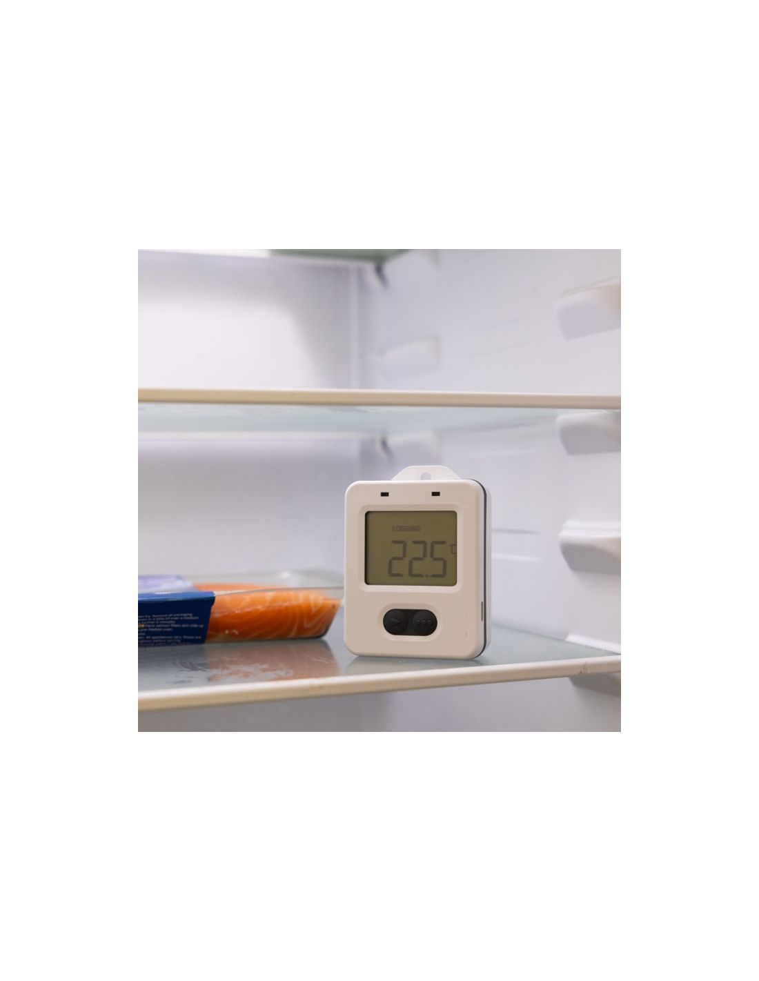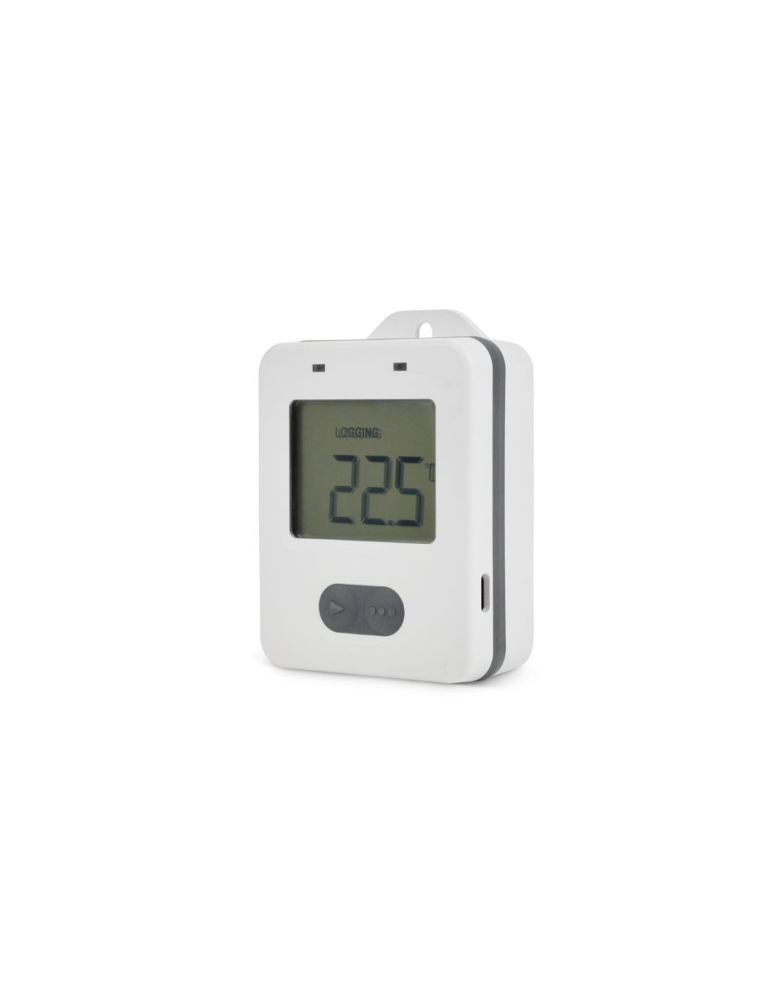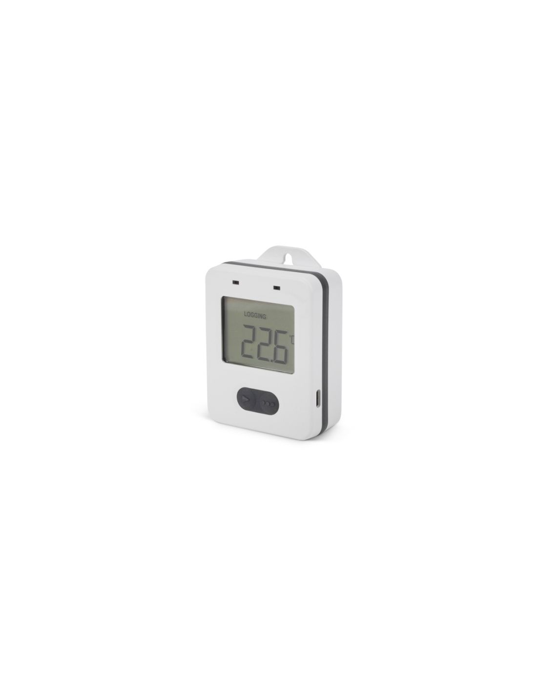 Duży wyświetlacz cyfrowy pokazuje aktualną temperaturę, górne/dolne limity oraz zarejestrowane temperatury maks./min. Rejestrator jest również wyposażony w czerwoną i zieloną diodę LED, które sygnalizują, czy rejestrowane są dane i czy przekroczone zostały limity alarmowe.