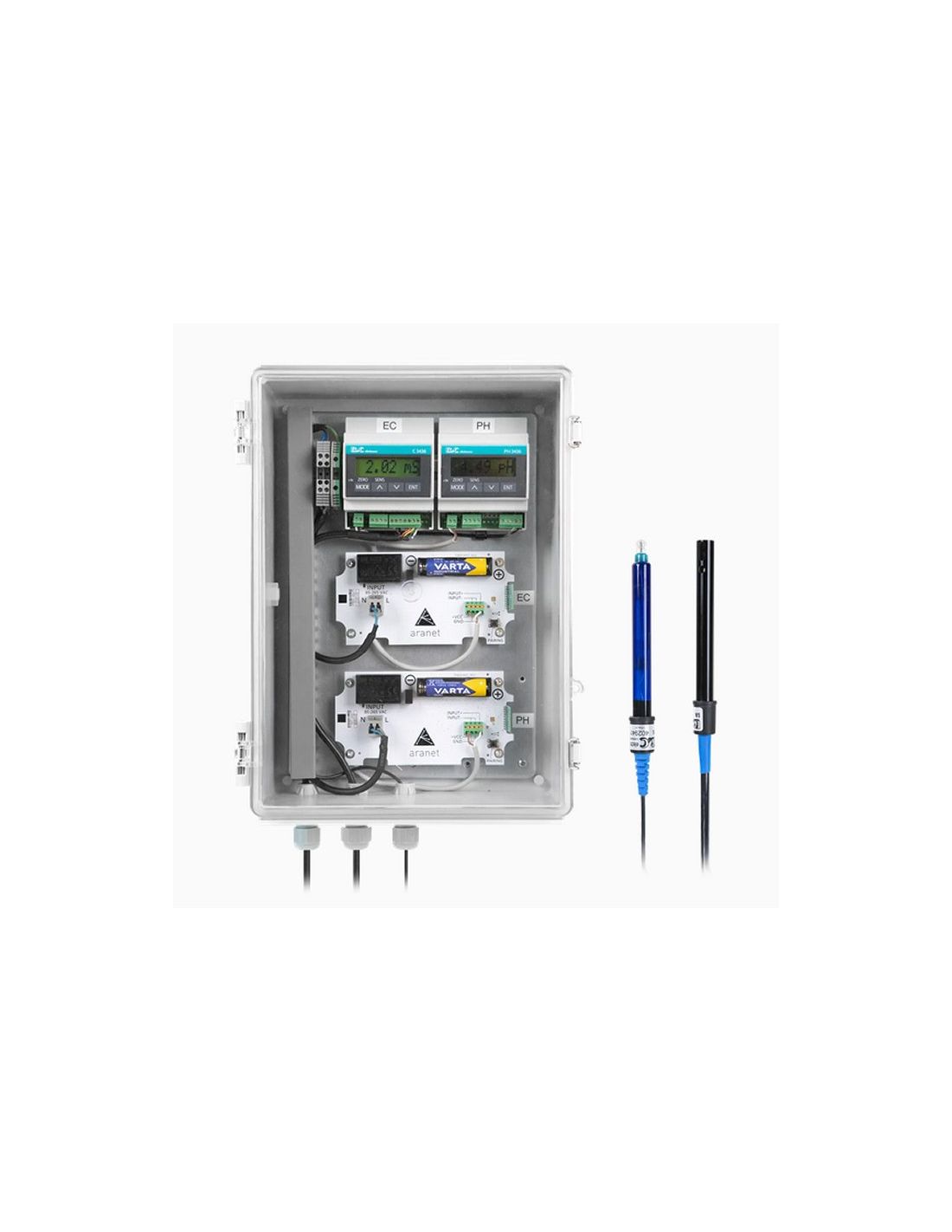 Bezprzewodowy miernik EC & pH do pomiaru przewodności elektrycznej i pH wody w celu uzyskania optymalnej jakości wody dla zdrowego wzrostu roślin. EC: 0-20 mS/cm; pH: 0-14, zasilanie 24V DC; IP67. Współpraca ze stacją bazową Aranet i chmurą Aranet.