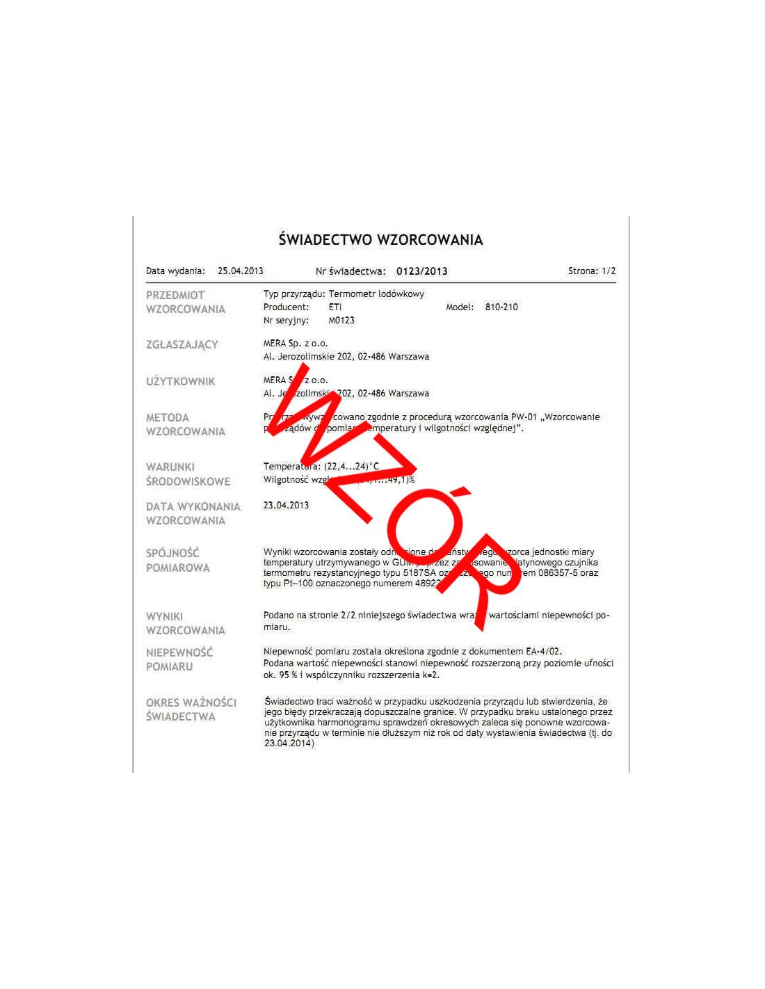 Świadectwo wzorcowania barometru, 6 dowolnych punktów